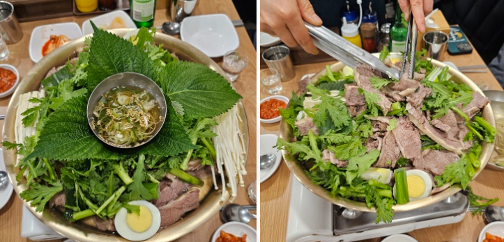 한우 수육, 선지, 각종 채소, 버섯 등을 큼지막한 놋그릇에 담고,