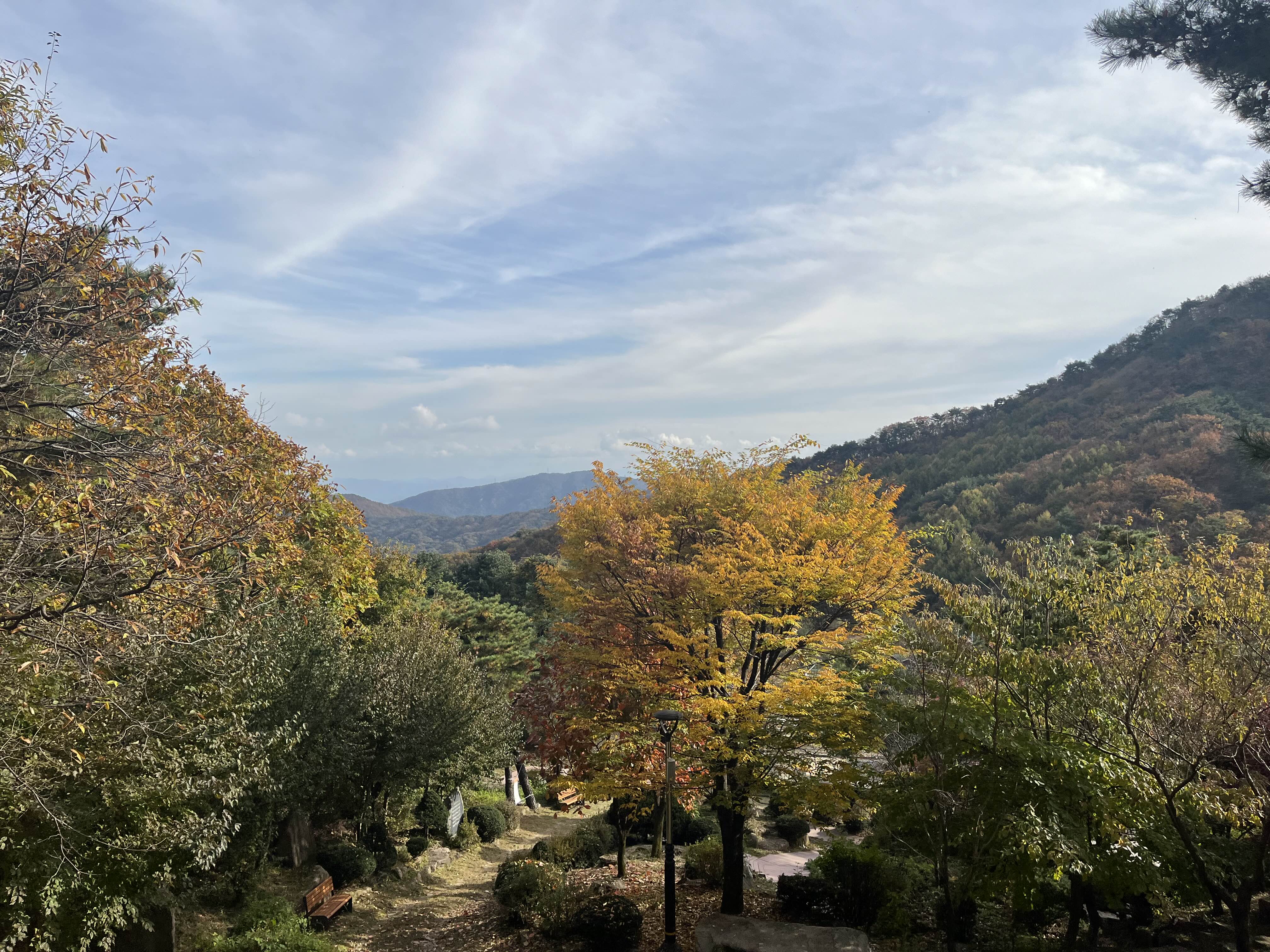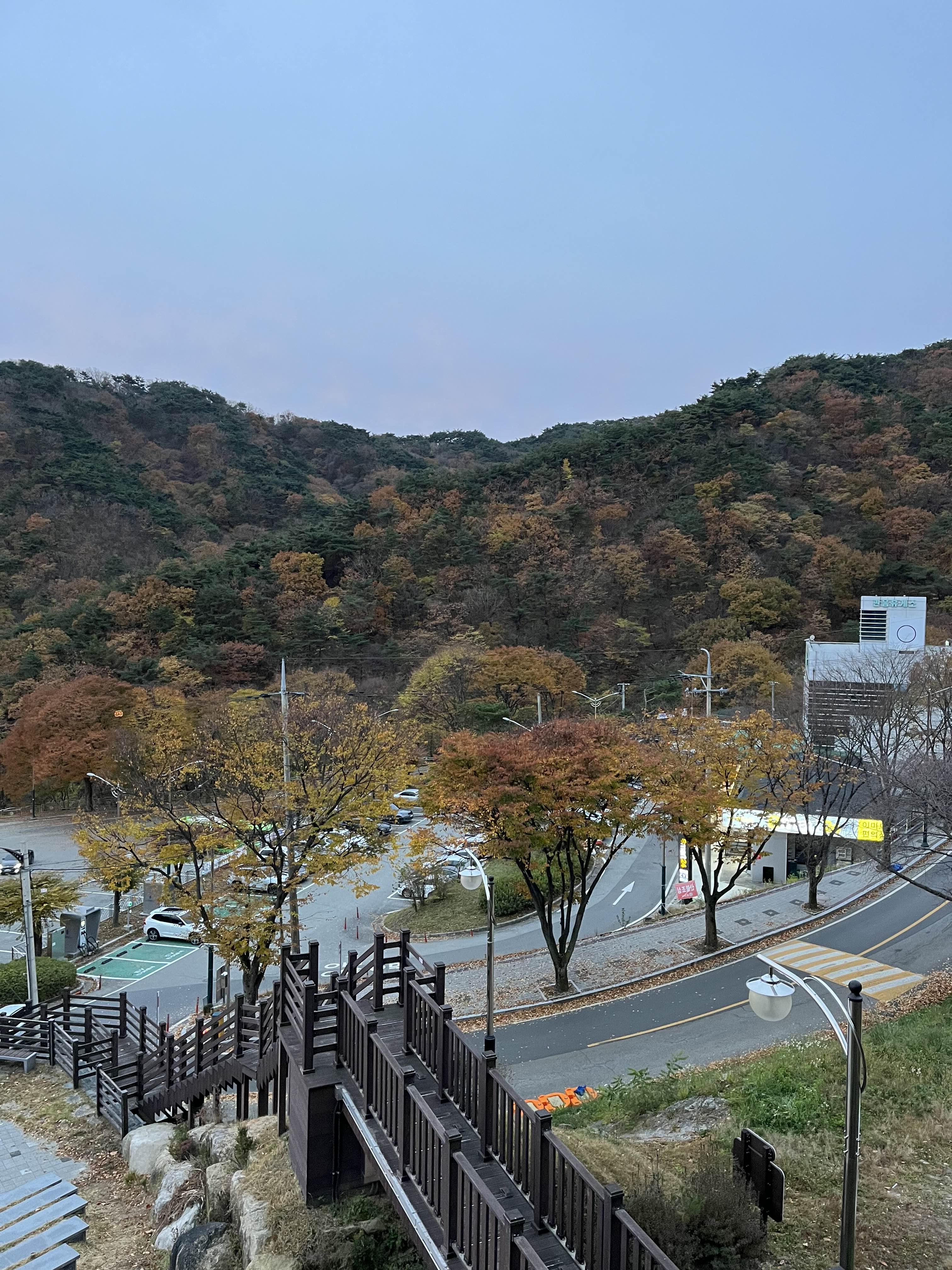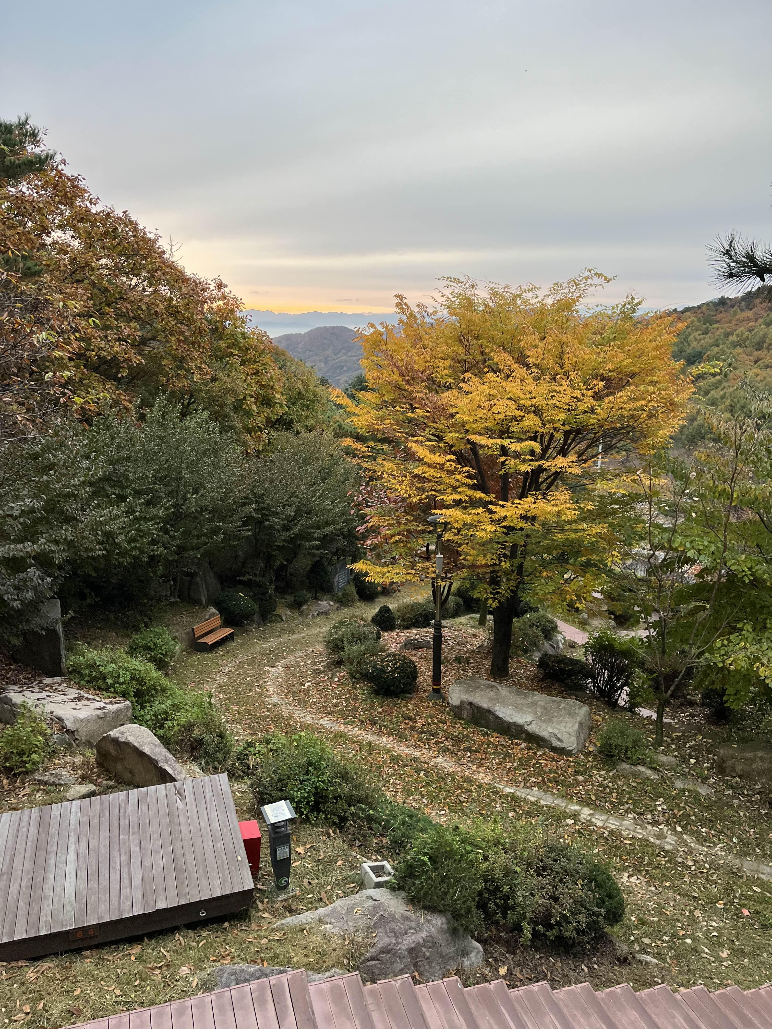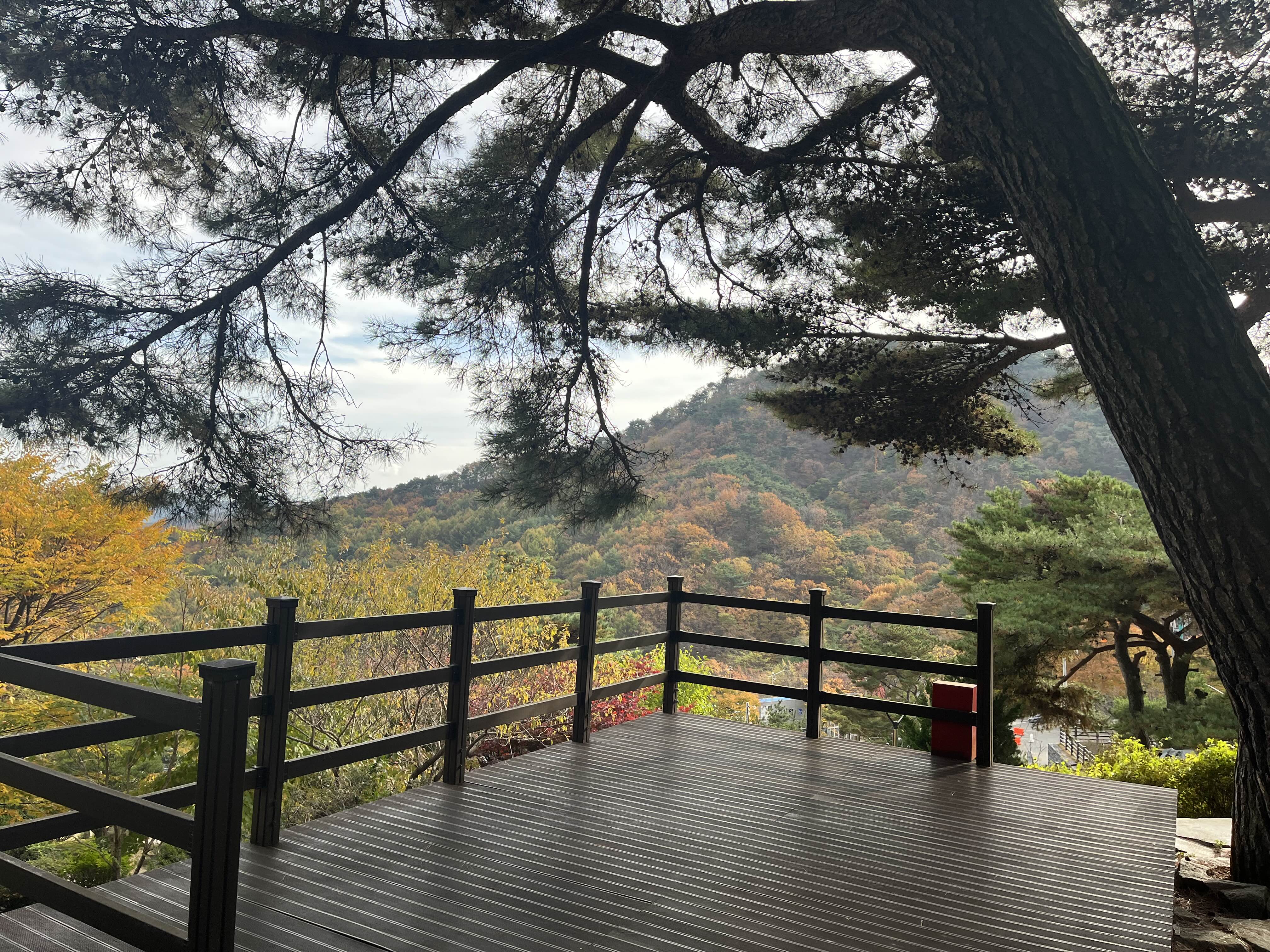 올라가는 데크 경사가 가파르지만 올라그면 올라갈수록 경치는 더욱 좋아집니다. 경사를 오르다 뒤를 돌아봤는데 무대 뒤편으로 예쁜 단풍이 너무 잘 보였습니다. 11월 중에서는 단풍이 가장 예쁘게 들고 비교적 춥지 않은 주말이 아닌가 생각이 들었습니다.