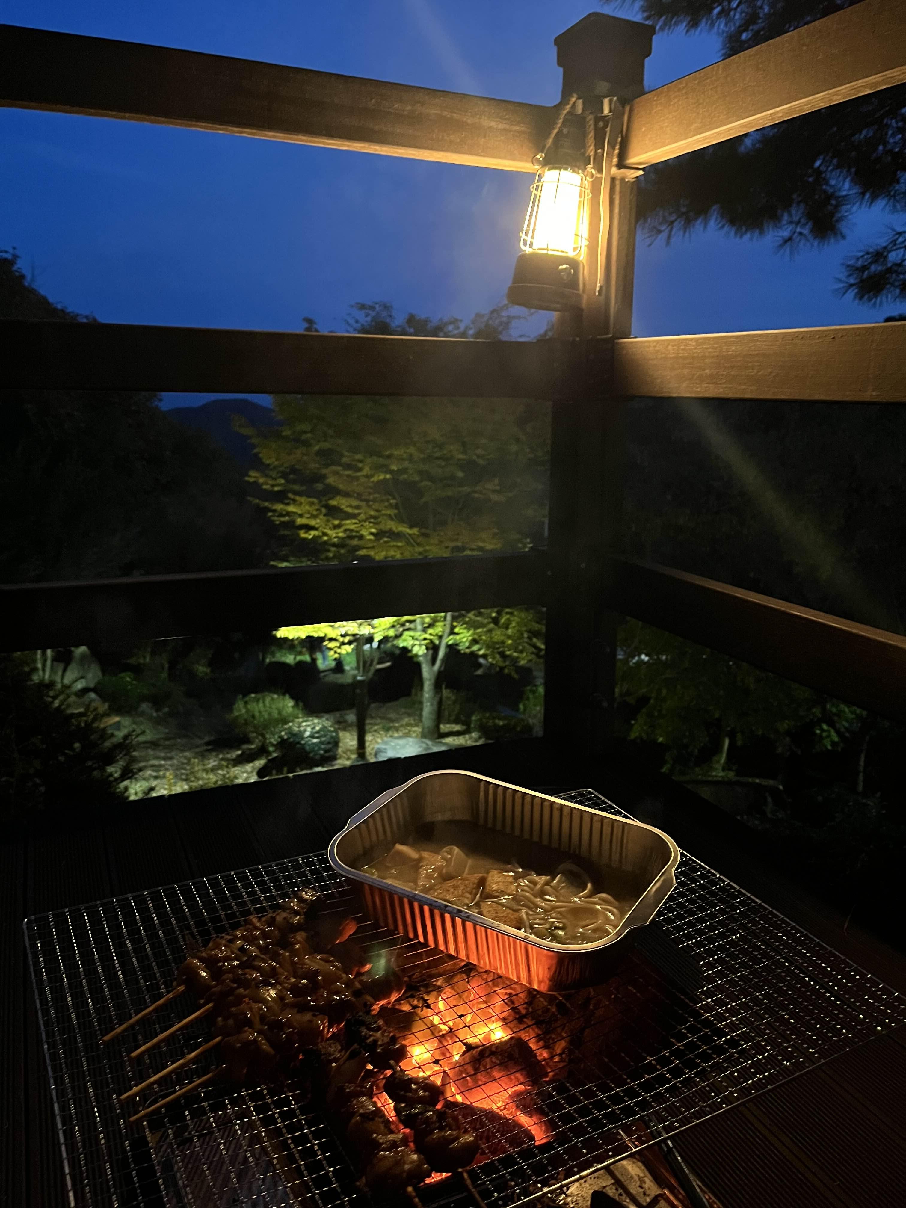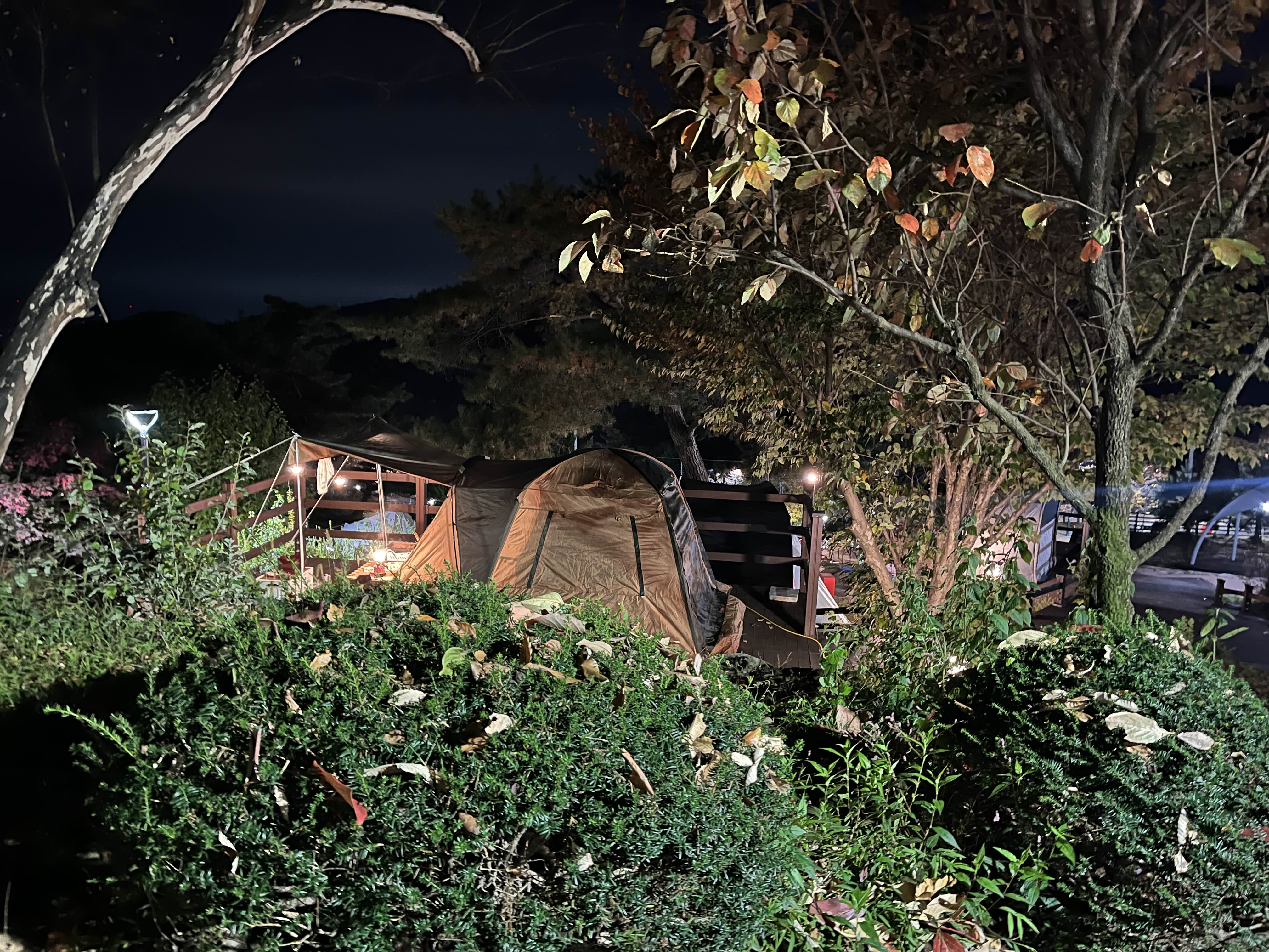 텐트를 치니 바로 옆으로 예쁜 단풍들이 줄지어 있었습니다. 멍하니 의자에 앉아 단풍을 구경하다 해가 점점 떨어져 텐트를 치고 저녁을 준비했습니다. 따뜻한 어묵탕과 숯에 불을 지펴 닭꼬치구이를 먹었습니다. 해가 짧아져서 먹는 동안 금방 해가 저물었습니다. 그래도 데크 주변으로 가로등이 잘 설치되어 있어서 어둡지 않았습니다.