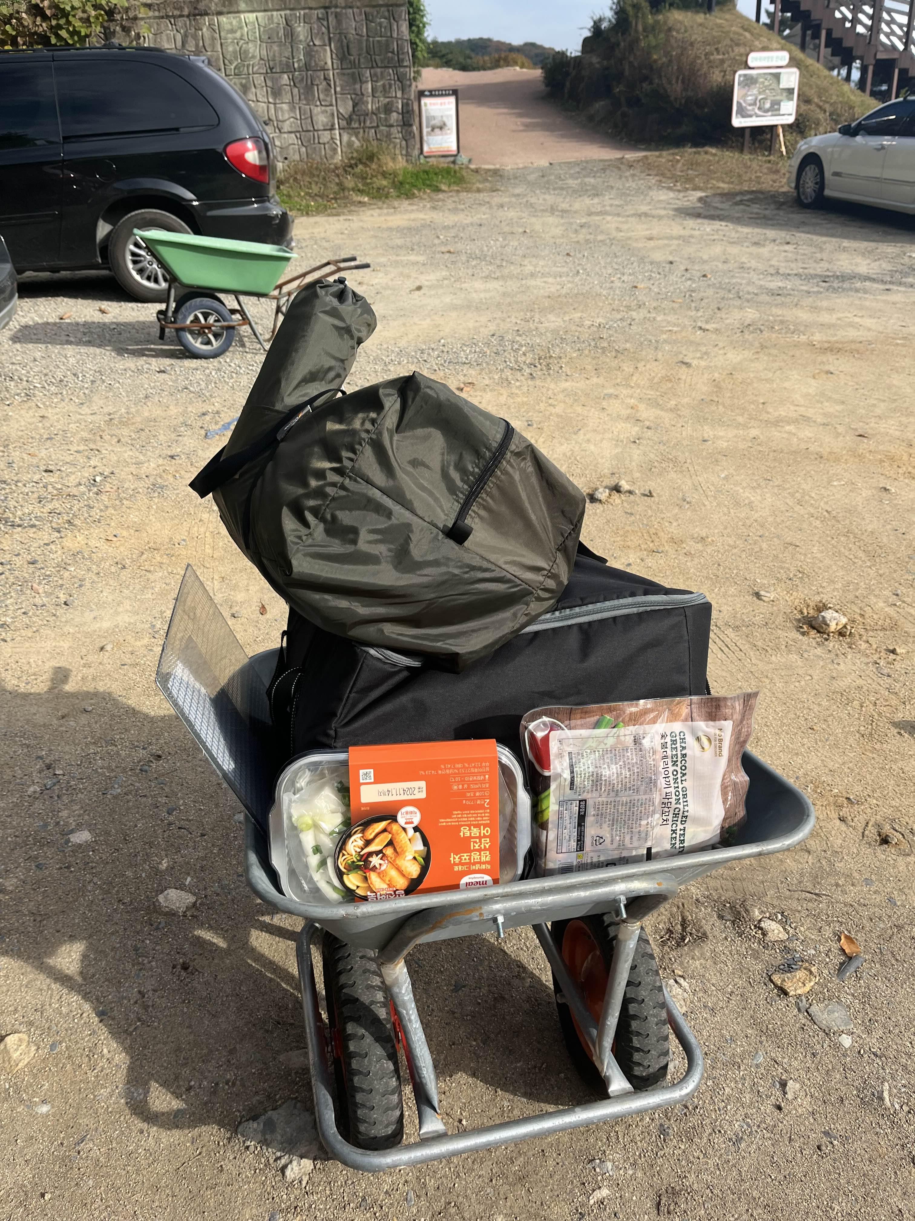안내를 받은 후 다시 야영장 주차장으로 차를 이동하여 짐을 내려야 합니다. 분리수거 쓰레기장 근처에 수레가 있어 짐을 옮기는데 도움이 되었습니다.