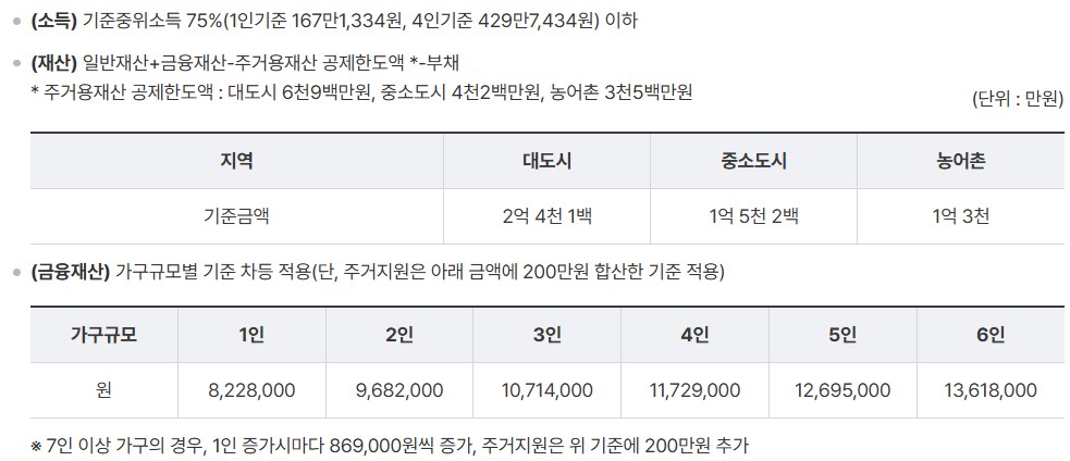 지원 기준으로는 소득 기준, 재산 기준, 금융재산 기준이 설정되어 있습니다.