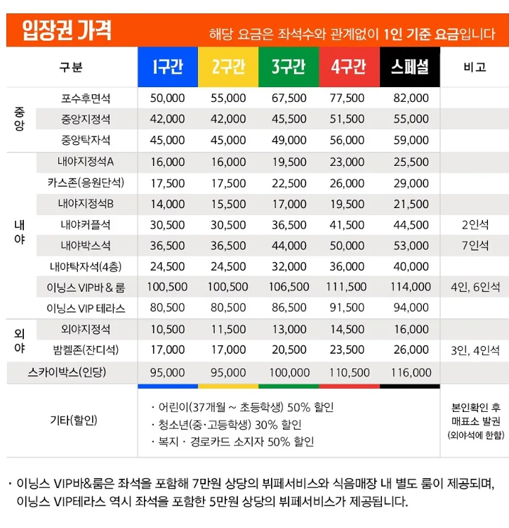 좌석의 위치와 경기의 중요도에 따라 티켓 가격이 달라지며,