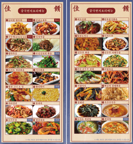 향라육슬, 지삼선, 철판도가니, 마파두부 등이 있습니다.