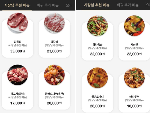 사장님 추천 메뉴로는 양갈비, 양꼬치, 꿍바오새우,