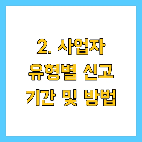 - 예정신고: 1기(1월 1일~3월 31일) - 4월 1일~4월 25일 / 2기(7월 1일~9월 30일) - 10월 1일~10월 25일