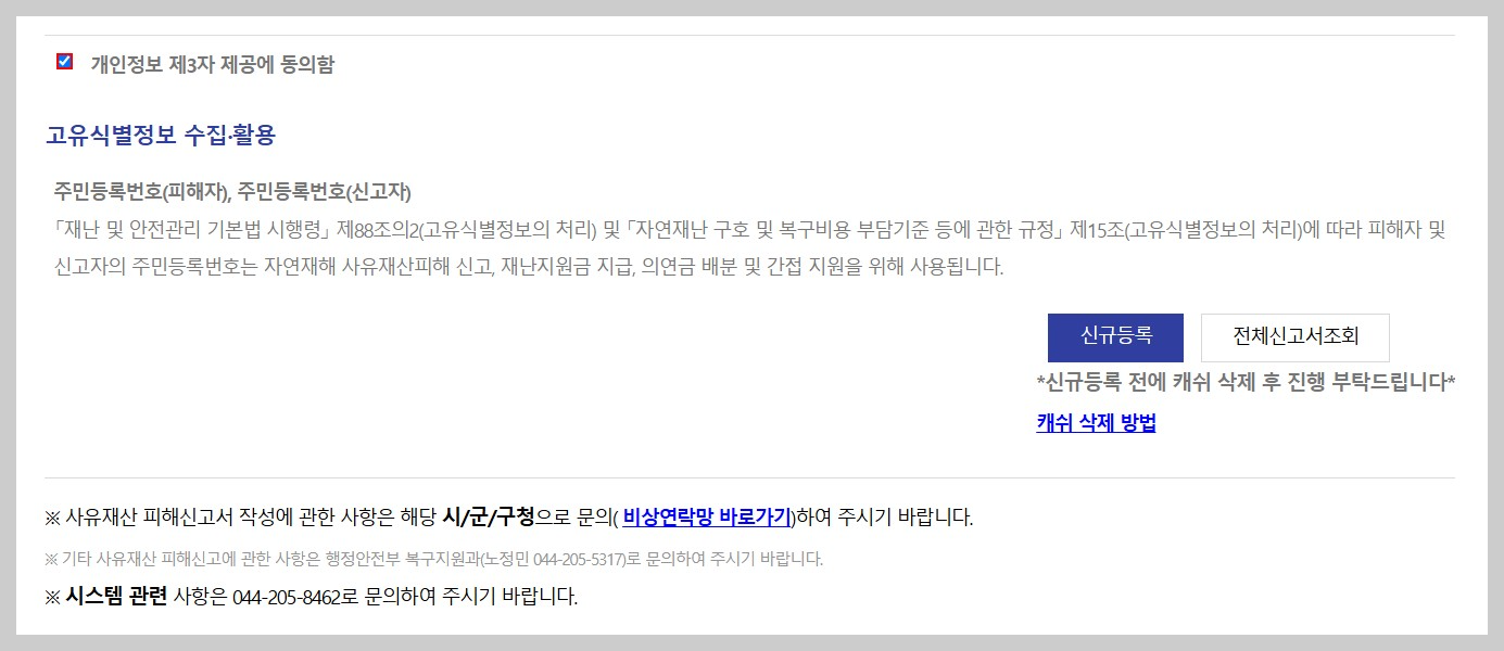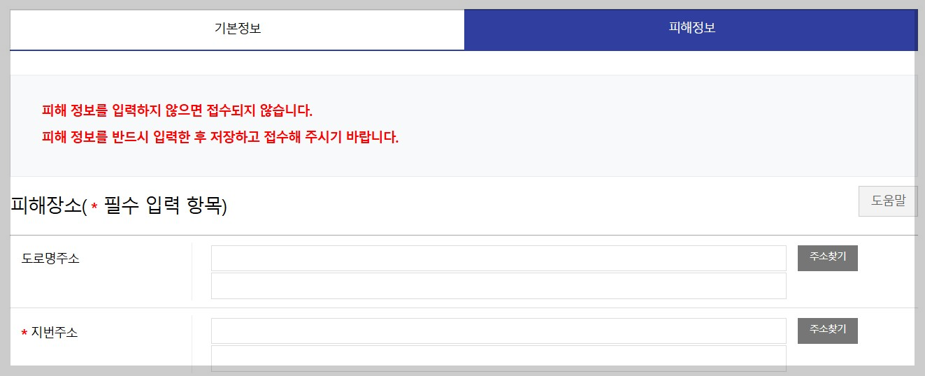 이 확인서를 받기 위해선 먼저 사유재산 피해신고를 해야 해요.