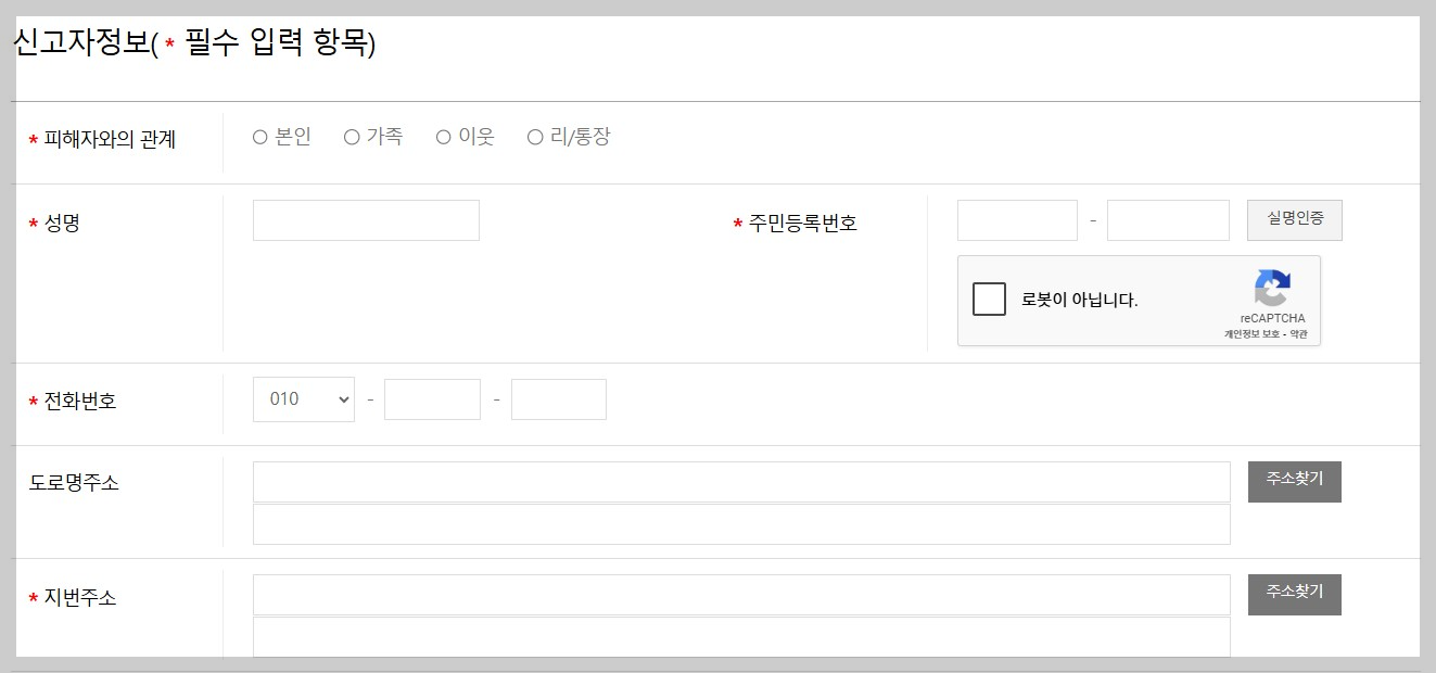 피해자와의 관계, 성명, 전화번호, 지번주소 등을