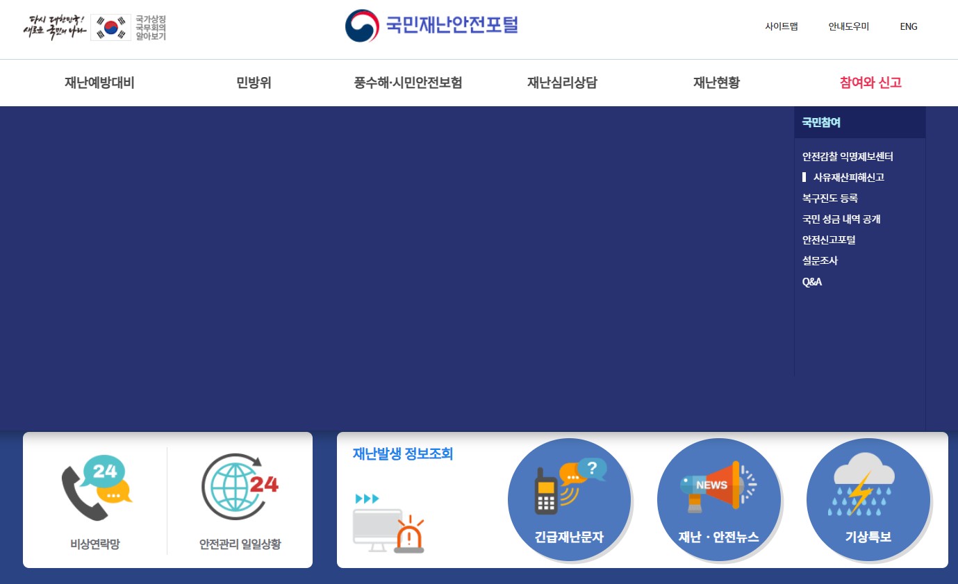 "참여와 신고" → "사유재산 피해신고" 메뉴로 들어갑니다.