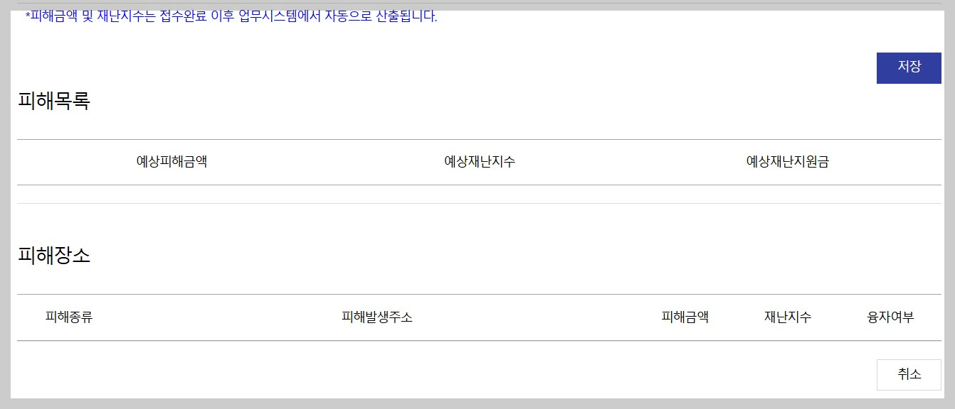 👉 피해종류, 피해물량 등을 작성하여 저장합니다.
