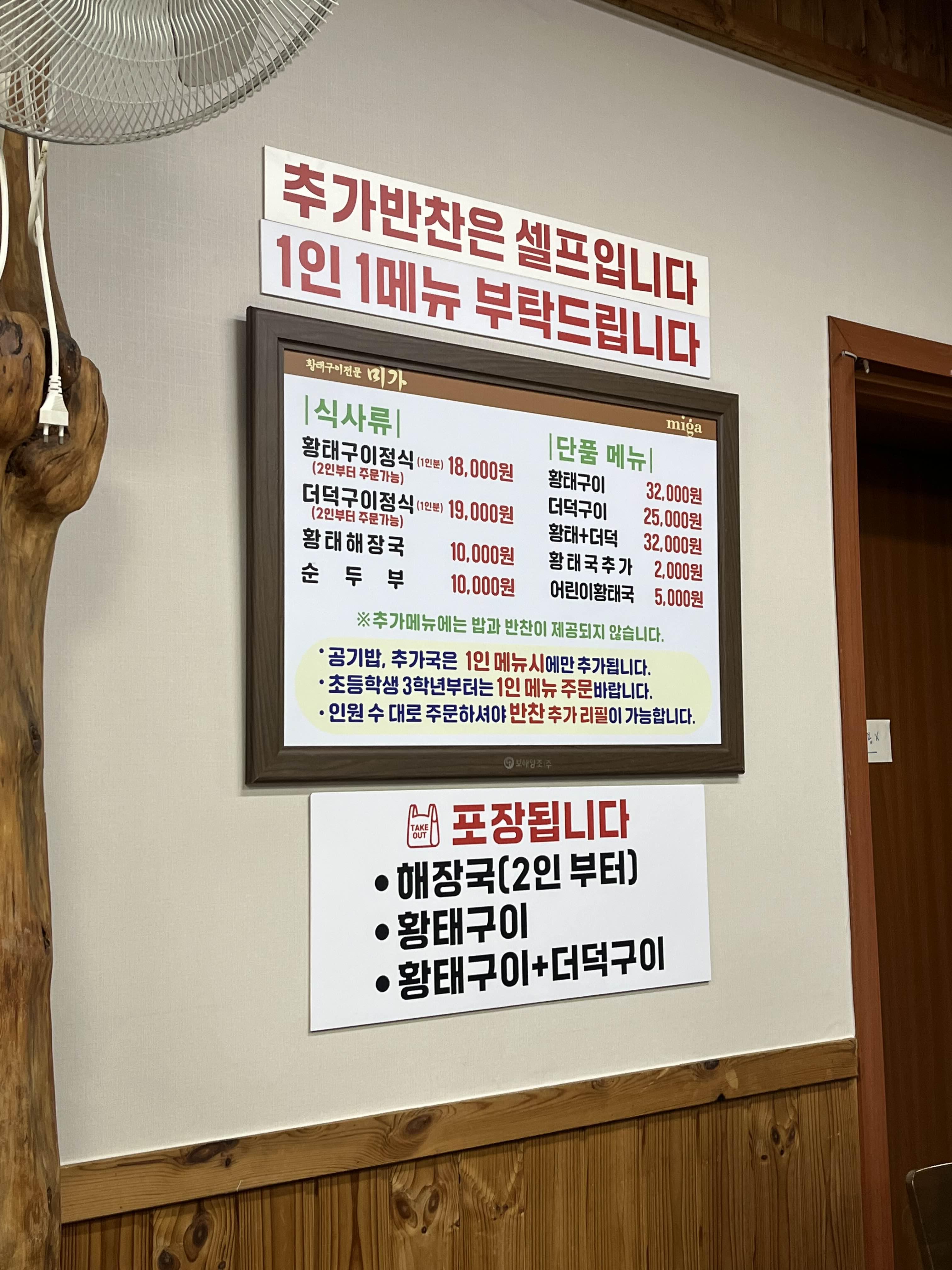 포장 가능 메뉴는 해장국, 황태구이, 황태+더덕구이입니다.