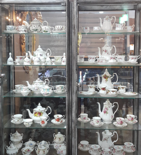 영국 왕실에서 쓰던 그릇과 주전자, 찻잔들이 가득해요.
