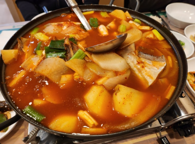 매운탕은 무, 콩나물 등이 들어간 전통 방식으로 제공되며,