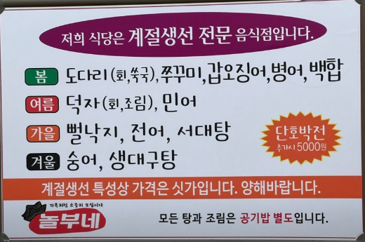 겨울에는 숭어와 생대구탕을 제공합니다.