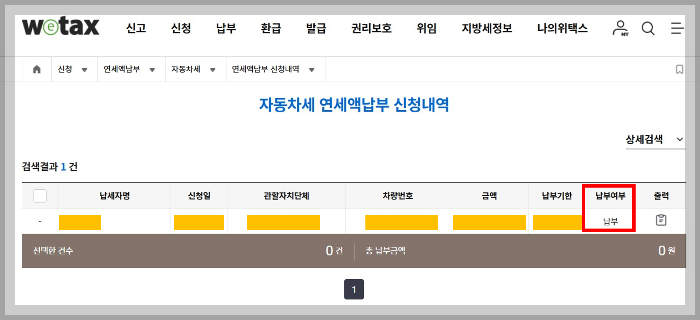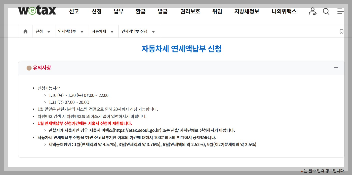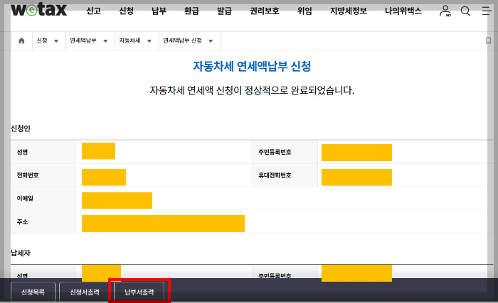 신청 >연세액 납부 > 자동차세 > 연세액납부 신청내역으로