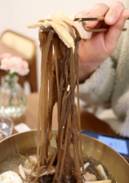 100도씨의 끓는 물을 사용하여 익반죽 된 후