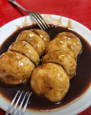 이곳의 찐빵은 단팥소스를 부어먹는 독창적인 방식으로 제공되며,