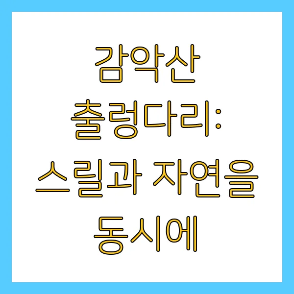 파주의 감악산 출렁다리 는 해발 675m에 설치된 길이 150m, 높이 45m의 다리입니다. 도전에 가슴이 뛴다면 이 출렁다리를 건너보세요! 싱그러운 산세와 하늘을 한눈에 담을 수 있어요. 😲