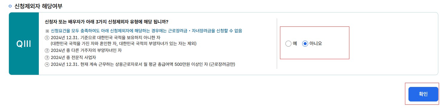 5. 신청제외자 해당여부 선택 > 최종 확인 선택