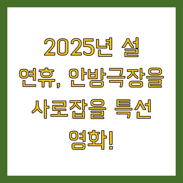 2025년 설 연휴, 무엇을 할지 고민이신가요? 집에서 편안하게 즐길 수 있는 설 특선 영화와 극장가를 뜨겁게 달굴 신작들! 가족, 연인, 친구와 함께 잊지 못할 설 연휴를 만들어보세요! 코미디, 액션, 드라마, 스릴러, 애니메이션까지! 취향 저격 영화들이 여러분을 기다립니다. 자, 그럼 어떤 영화들이 준비되어 있는지 한번 살펴볼까요? 😉