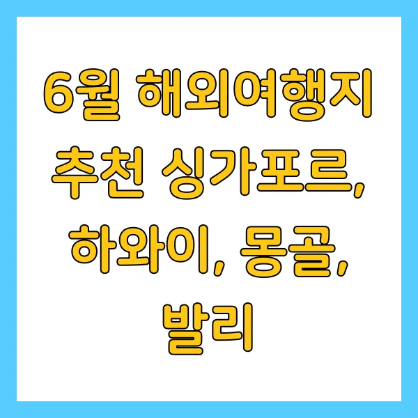 여행을 계획할 때 가장 중요한 요소 중 하나는 바로 '언제'와 '어디로'입니다. 6월은 비교적 저렴한 항공권과 쾌적한 날씨가 공존하는 시기로, 해외여행을 떠나기 이상적인 달입니다. 이번 글에서는 6월에 방문하기 좋은 해외여행지 네 곳, 싱가포르, 하와이, 몽골, 그리고 발리를 추천드립니다. 각각의 여행지는 독특한 매력과 풍경을 제공하며, 각기 다른 경험을 선사할 것입니다.